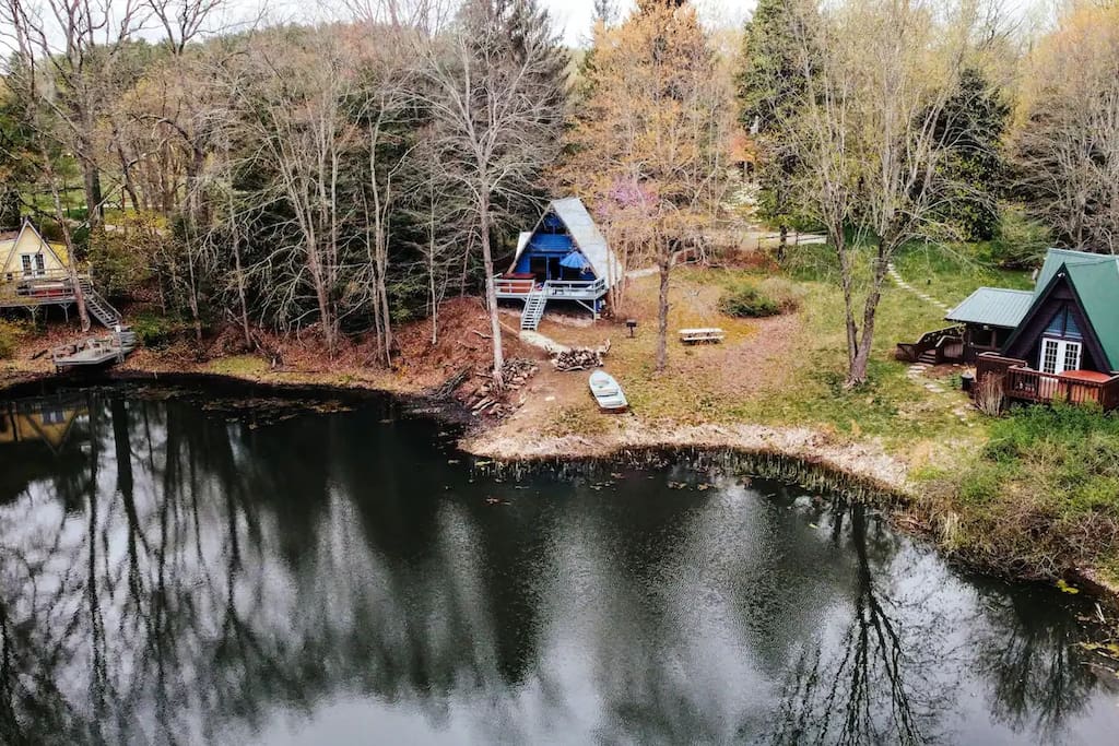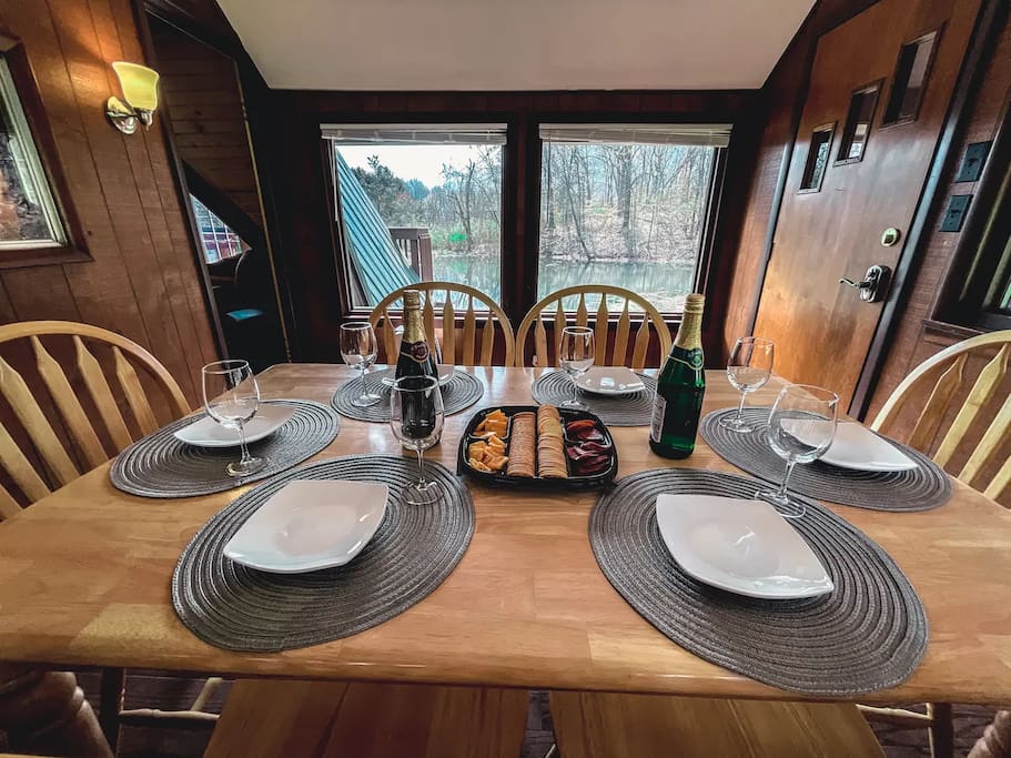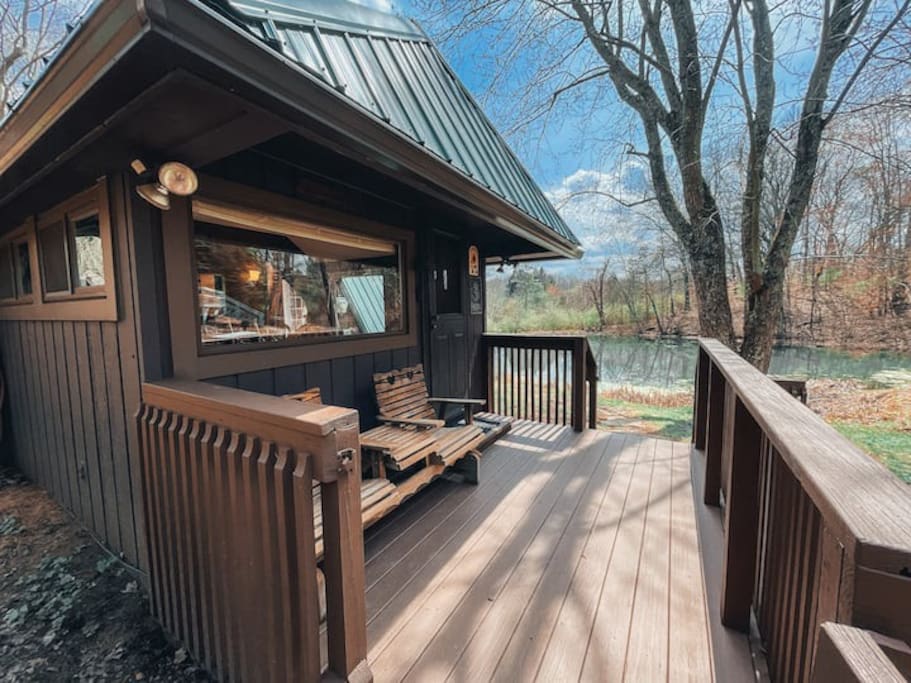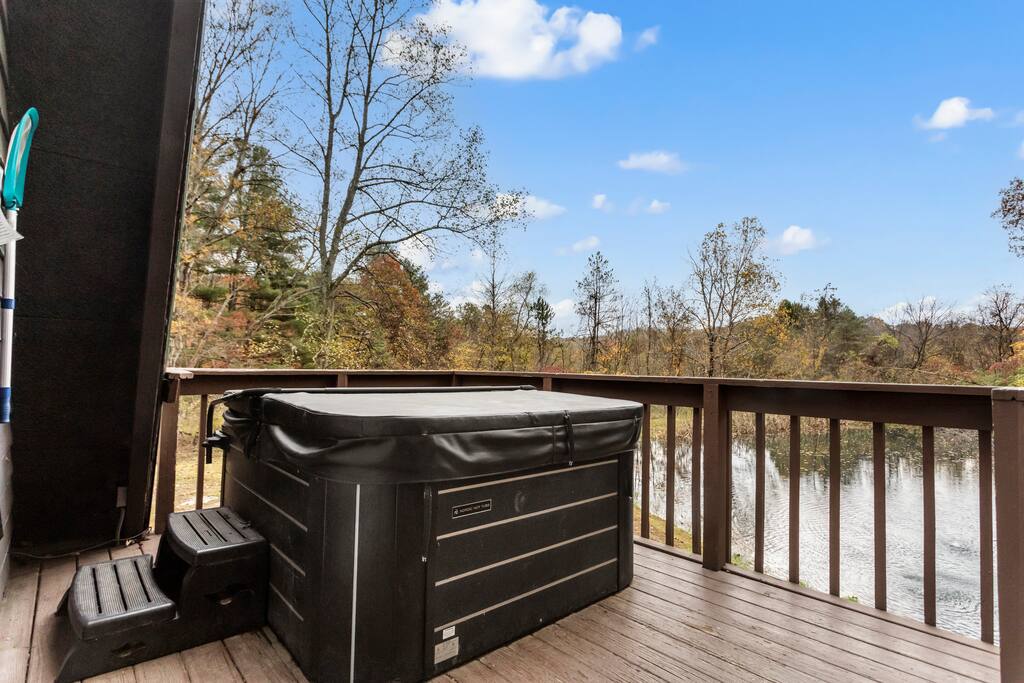 Come visit the beautiful Edgewater Escape cabin where you can create unforgettable memories with your family and friends. Enjoy the newly updated cabin that welcomes you right inside the front door. Drink your coffee (Keurig and Pods provided) each morning on the deck watching the wildlife waking up on the pond. Get up close and connect with nature on the rowboat or catch and release fishing (bring your own gear!). Cozy up under the stars at the firepit, while roasting marshmallows and relishing each other’s company. After a long day of hiking on the beautiful trails at Hocking Hills, kick back and luxuriate in our hot tub while having your favorite beverage taking in the peacefulness of nature with gorgeous trees, a view of the woods, and a large outdoor green space. This 2-bedroom and 1 bath cabin includes a private bedroom on the main level with a queen size bed and a loft with two full size beds. Cook your meals in our fully equipped kitchen or grill out on the deck! Along with the private pond, you can also take advantage of a private lake and swimming area just a short distance away. Edgewater Escape is one of three A-frame cabins nestled around their own private pond and provides the perfect retreat for you, your family, and your guests! We can accommodate larger groups with our family of cabins, please contact us to learn more. There’s no better way to start your Hocking Hills getaway than here at Edgewater Escape!