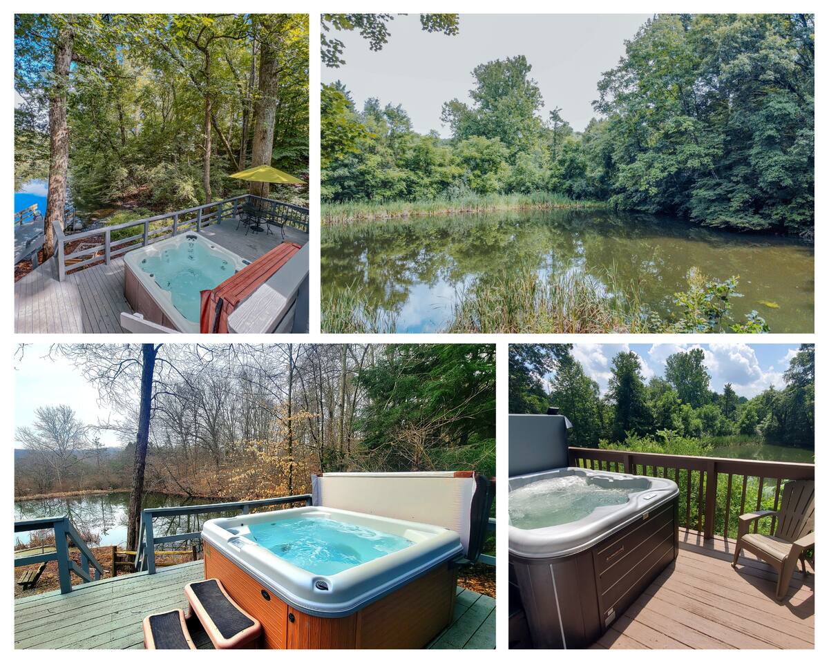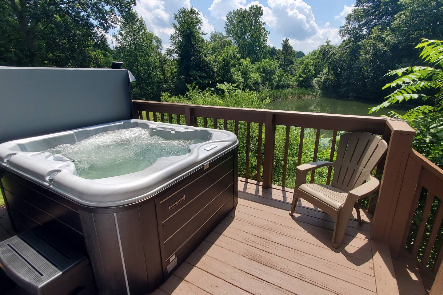 Nestled upon a private pond, enjoy the unique spaces and amenities provided by each of the three A-frames. Run about the entire property with fishing poles for catch and release fishing, visit each other around the fire pits, or star gaze while enjoying the hot tubs. Each cabin comes equipped with: ◉ Hot tubs ◉ Fireplace ◉ Full Kitchen ◉ Propane Grill (propane provided) ◉ Full bath ◉ Fire pit ◉ Outdoor seating ◉ Smart Tv ◉ Internet/Wi-Fi ◉ Contact-free entry ◉ Row boat The Lake Life Cabin: ◉ Sleeps 6-7 ◉ 2 bedrooms (queen size beds) ◉ 1 queen mattress in loft area ◉ 1 full size bean bag bed ◉ 1 bathroom The Whispering Waters Cabin: ◉ Sleeps 4 ◉ 1 queen bed in loft area ◉ 1 double bed in main level bedroom ◉ 1 bathroom The Edgewater Escape Cabin: ◉ Sleeps 4-6 ◉ 1 queen bed in main level bedroom ◉ 2 double bed futons in loft area ◉ 1 bathroom Come and enjoy the great Hocking Hills with your own private retreat to share with your family and friends!